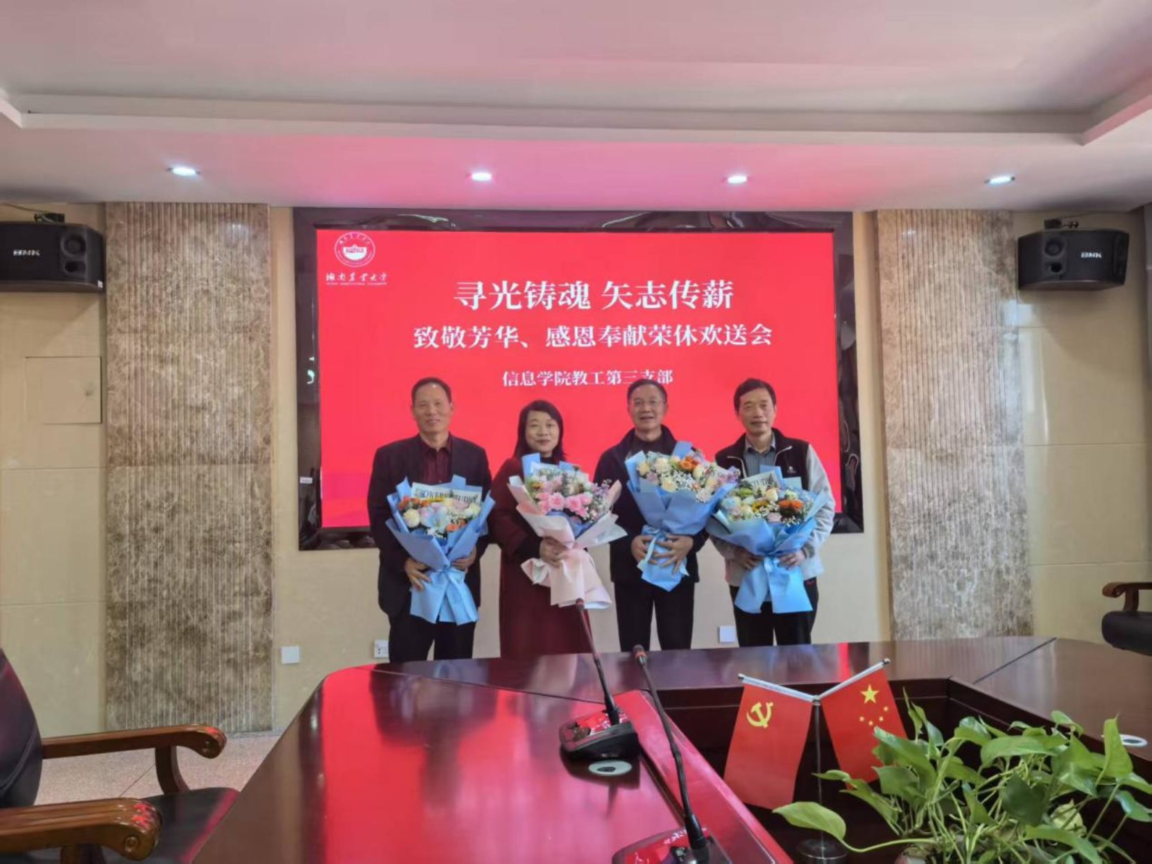 寒冬虽至,情暖意长。信息与智能科学技术学院教工三支部全体党员齐聚一堂,围绕“寻光铸魂,矢志传薪”主题,举行了一场温馨隆重的主题党日活动,为邹锐标、伍慧姣、周玉元、周铁军四位教师举办荣休欢送会,共同致敬他们数十年来为党的教育事业和学院发展所奉献的青春、智慧与汗水。